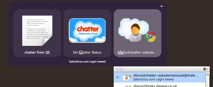 My previous ramblings about Spotlight left me thinking about a Quicksilver plugin, I use Quicksilver way more than Spotlight, plus Quicksilver is extensible (if poorly documented) with additional plug-ins, so I put together a Quicksilver plug-in for Salesforce, download the plugin, expand the zip, double click the plugin file to install it into Quicksilver, then goto the Quicksilver properties to setup your Salesforce login info. After that, there's 2 new actions, the first is search, associated with QS's text mode (e.g. hit ctrl-space to bring up QS, hit ., type foo, tab to the action menu and select search salesforce, takes 10 times longer to explain than to do). The 2nd action is associated with files, and allows you to easily upload a file into a document in Salesforce.com.